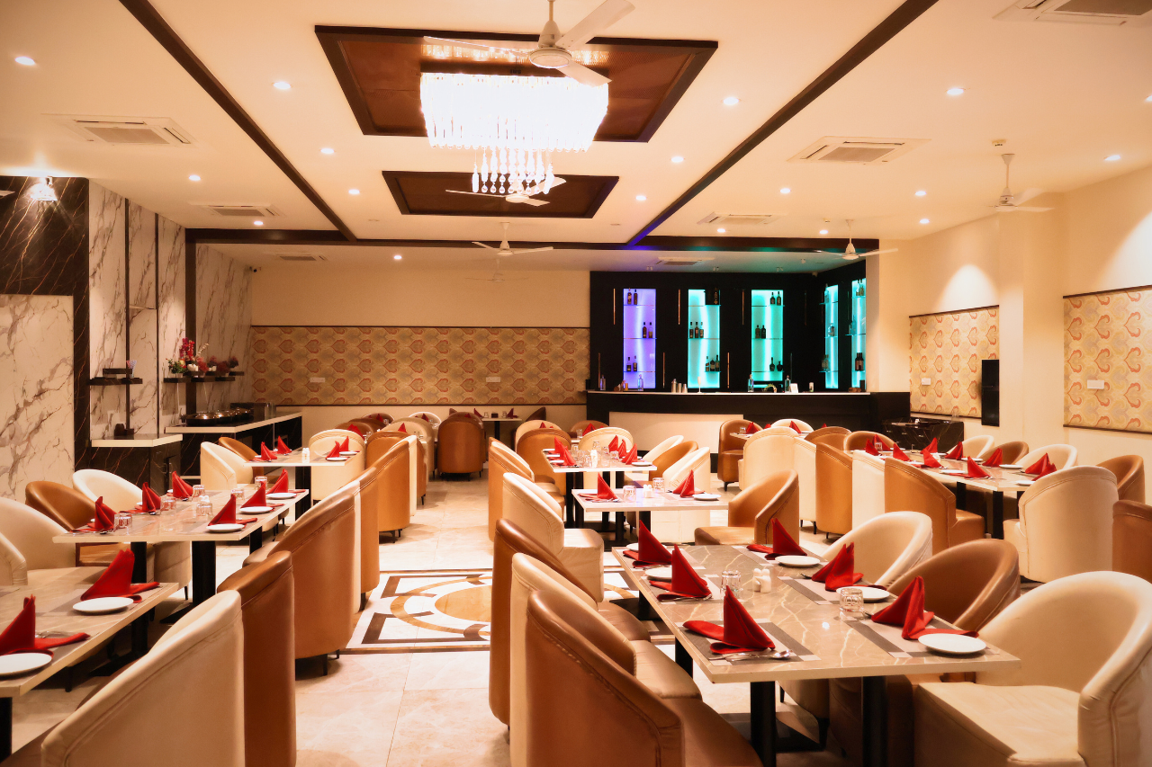 Radhamangal offers multiple dining experiences, including an elegant restaurant, rooftop dining, bar dining, banquet dining, and in-room dining to suit every preference.